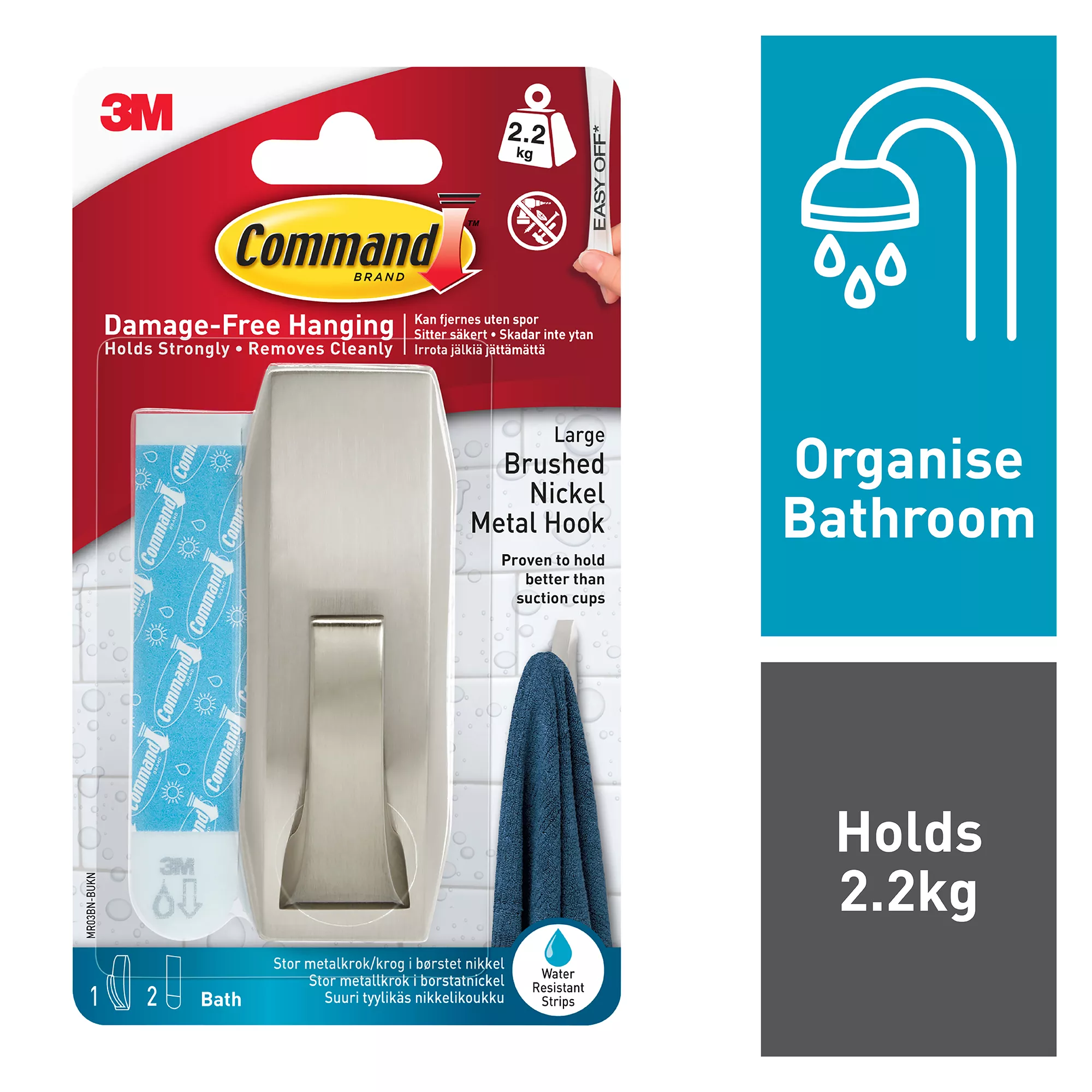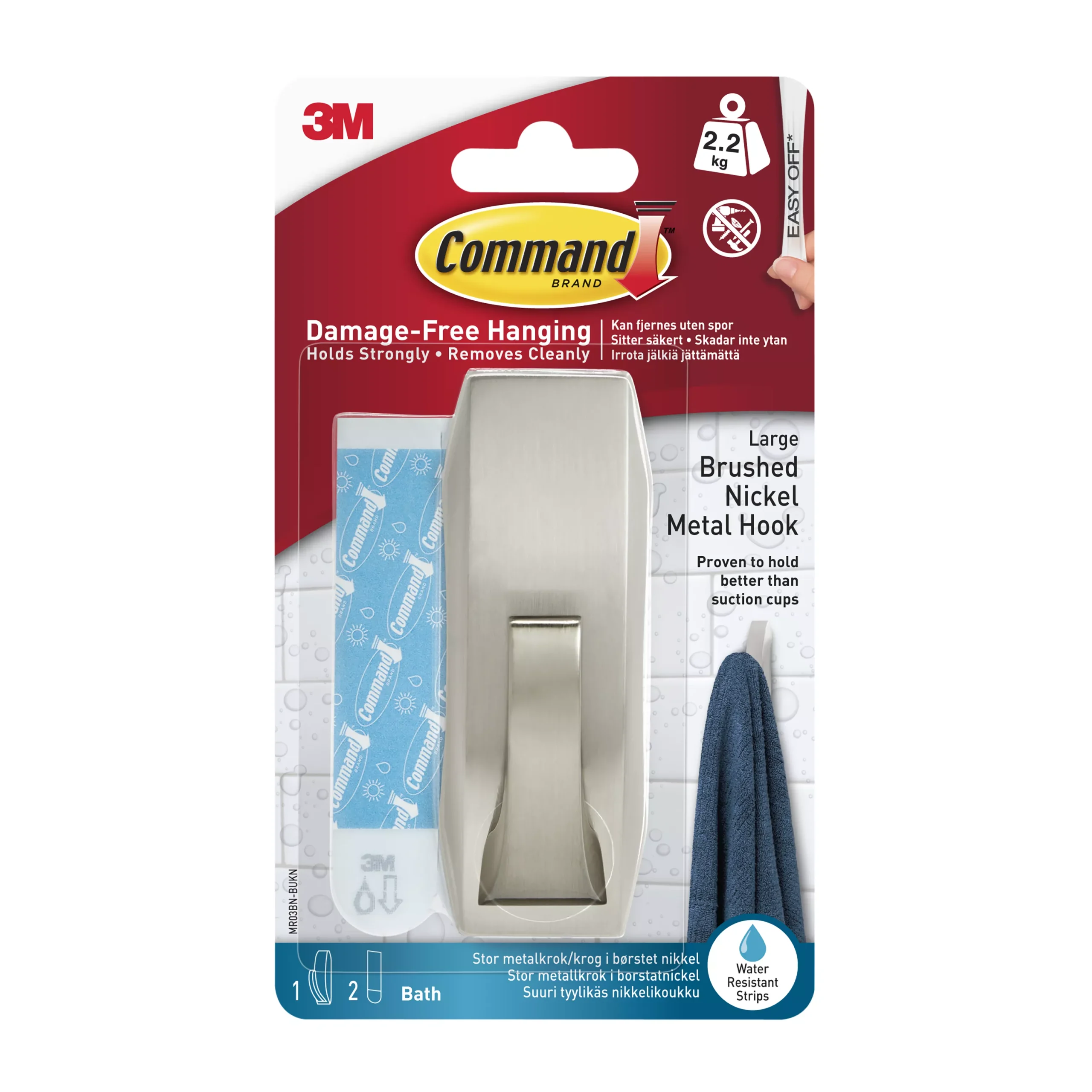 Hang towels and other bathroom items in wet and humid environments with Command™ Large Satin Nickel Metal Bath Hook. This premium metal hook adds a finishing touch of style to any bathroom or cloakroom. They hold strongly to a variety of surfaces including solid, hollow and painted walls, as well as other materials including wood, tile, metal and glass. They leave no holes, marks or sticky residue when removed. These hook and strips are ideal for hanging medium-weight items in wet and humid places such as bathrooms and kitchens. Rehanging it is as easy as applying a Command™ Clear Refill Strip, so you can take down, move and reuse it again and again.