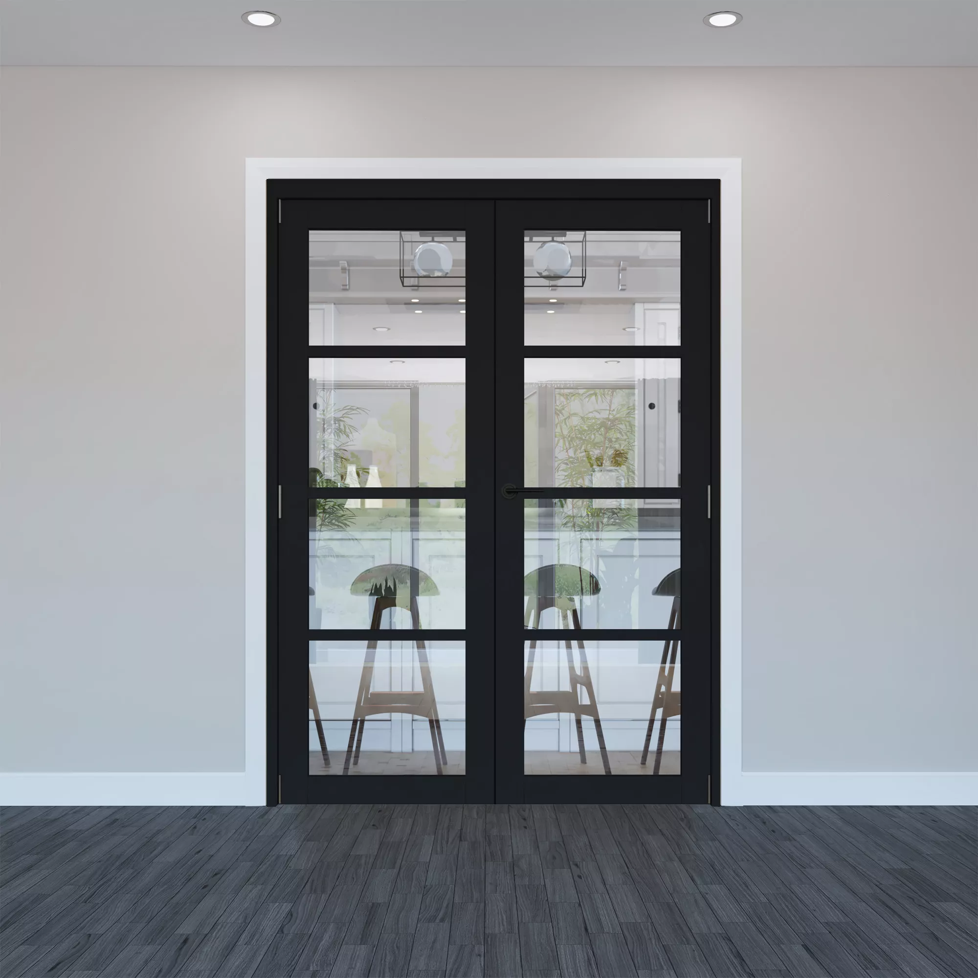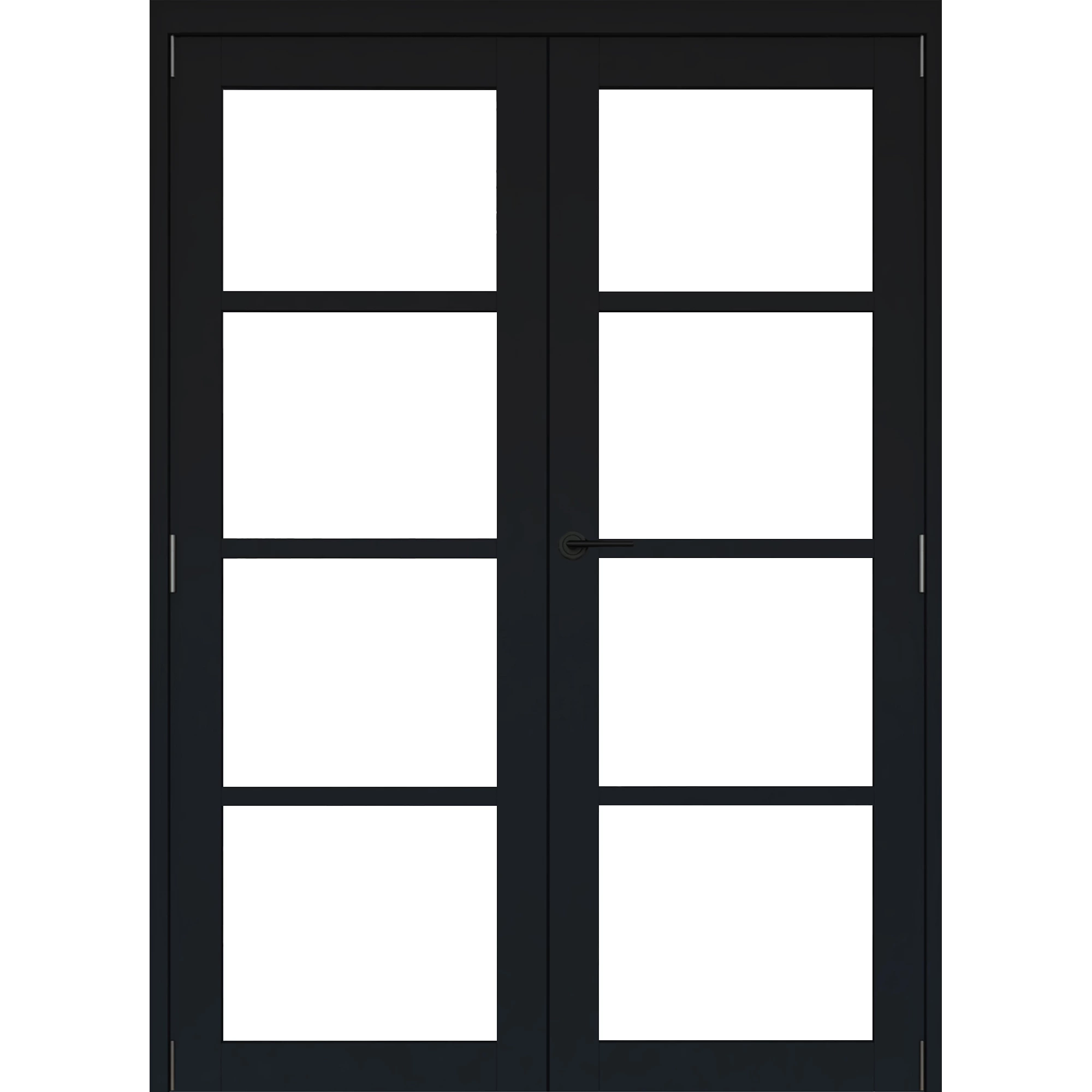 This internal French Door set is factory-finished in low-sheen black paint, ready for installation in your home. It features a contemporary 4 light design with narrow glazing bars, factory-fitted with clear toughened glass. Supplied complete with 2 doors, a matching frame pack, hinges and a shoot-bolt, it is the ideal solution for dividing 2 rooms in a super-stylish way.
