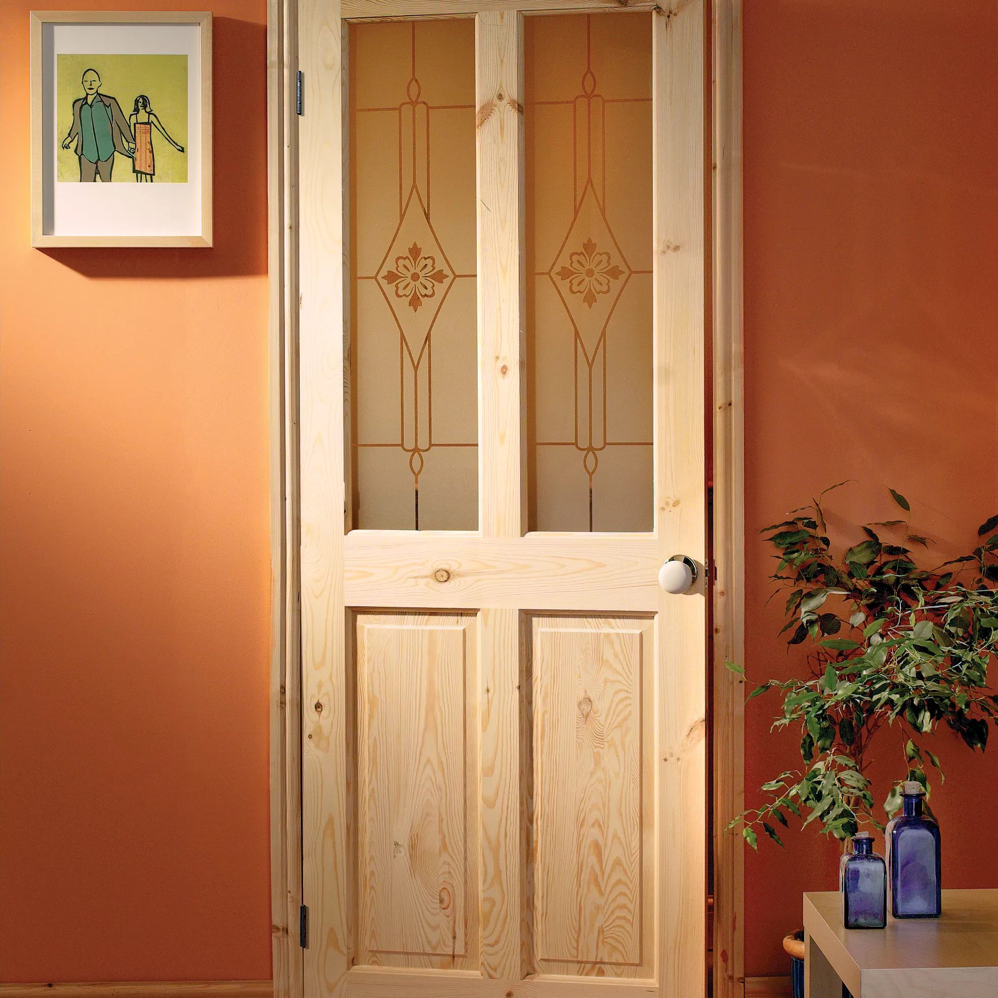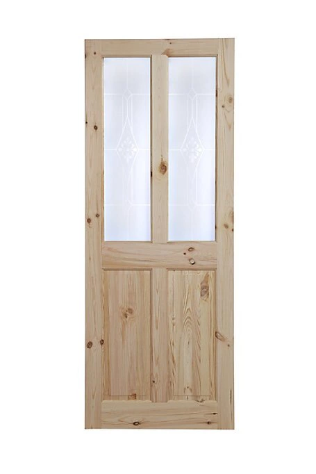- This 4 panel knotty pine glazed door is perfect for spreading light between rooms. The frosted safety glass has beautiful transparent detail, that ensures your interior space remains filled with natural light, whilst maintaining the privacy that is expected within your home. This door is ready to be stained, varnished or painted and is FSC approved which guarantees that any wood we use is 100 percent forest friendly.