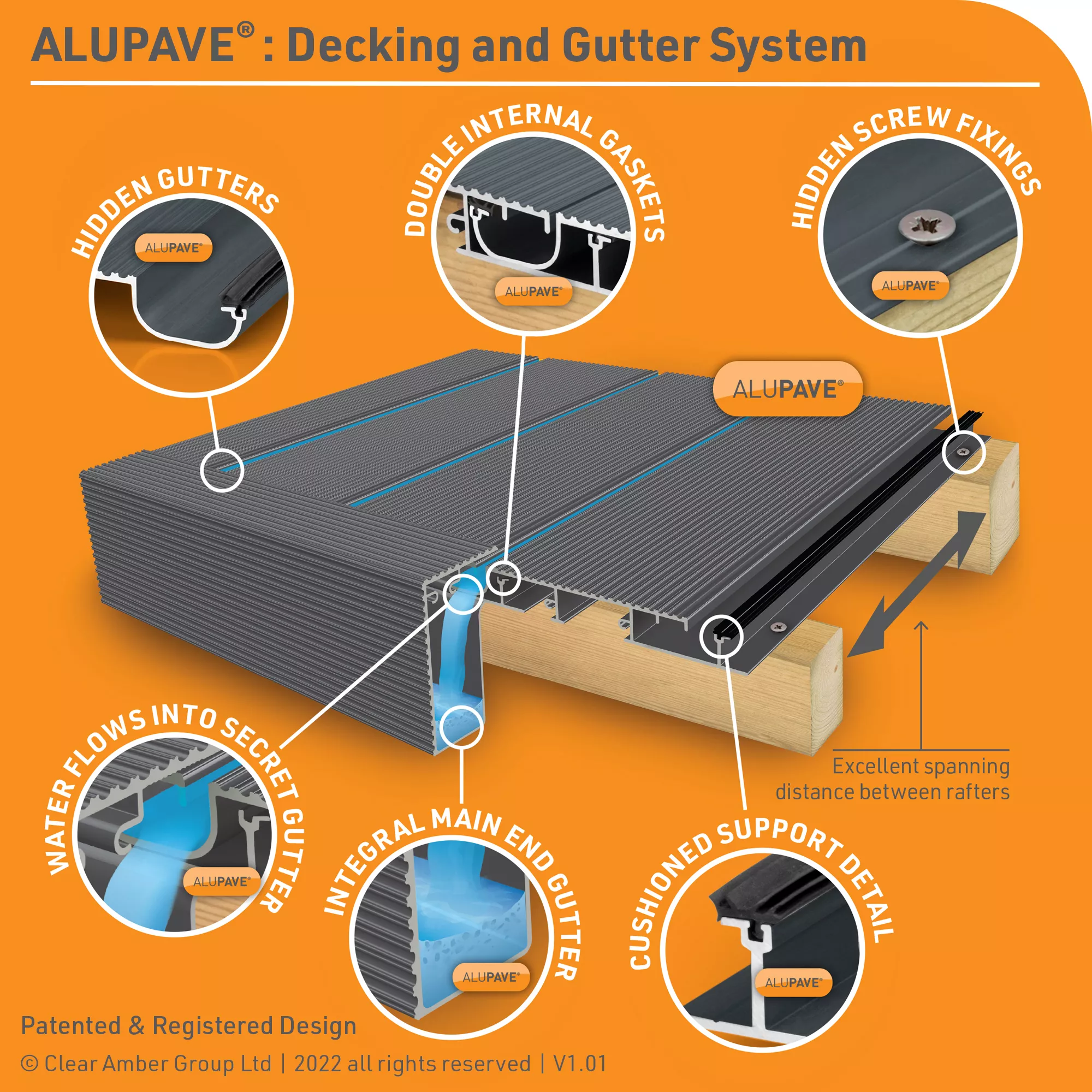 This Alupave decking and flat-roofing system combines a number of patented, innovative features that make it truly unique.