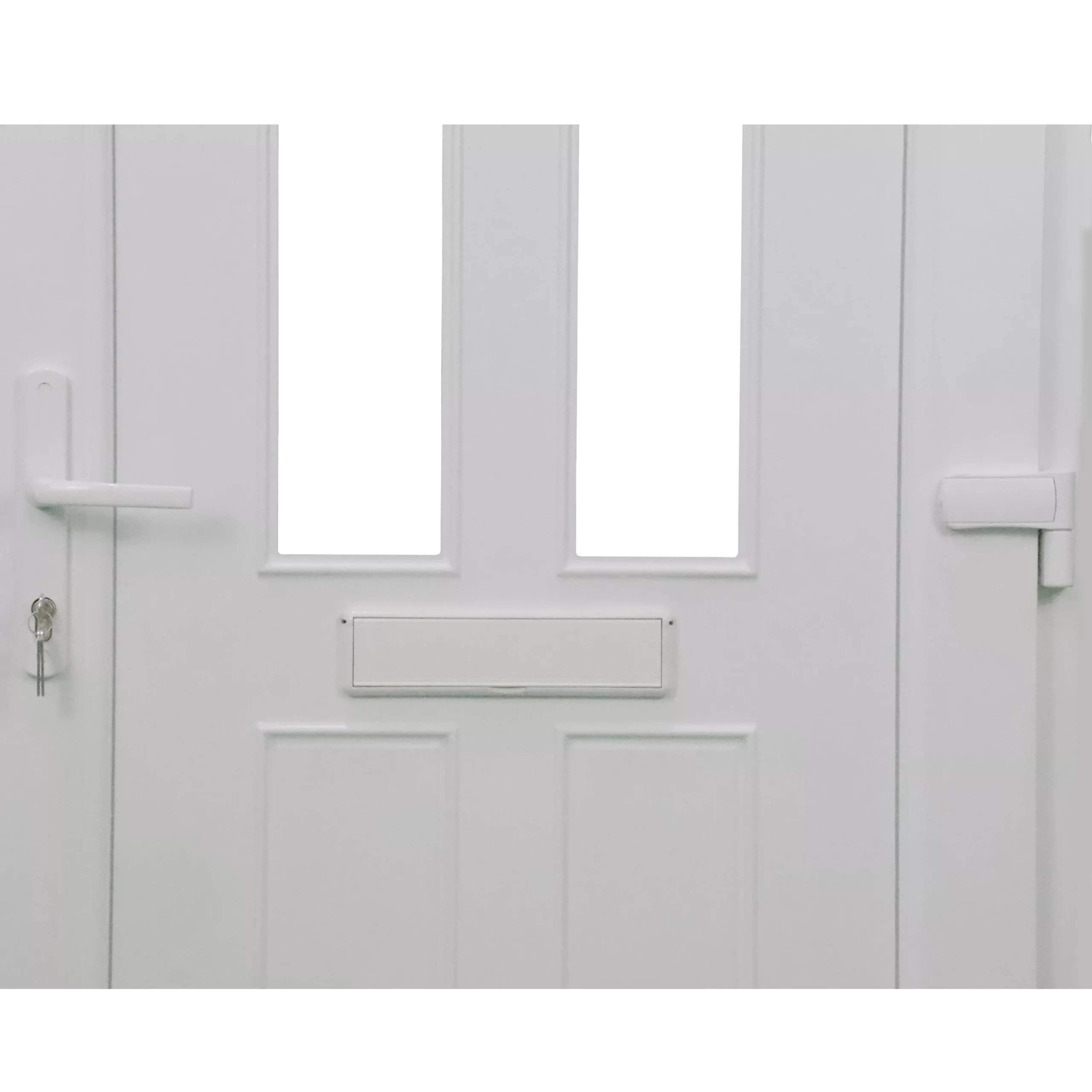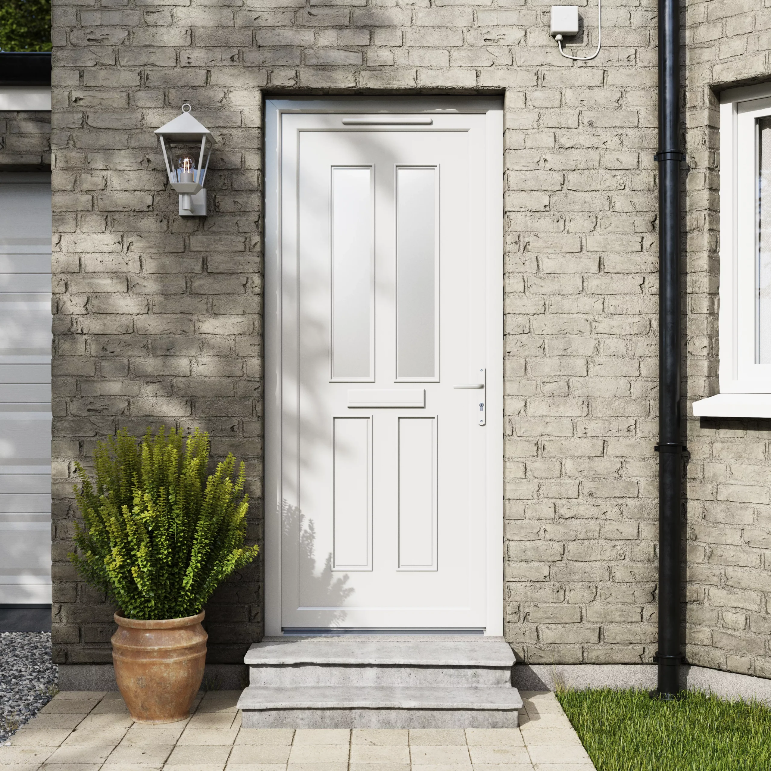 Introducing the Fortia Chesil Frosted Double Glazed White Left-hand External Front Door set, an elegant and secure addition to any home. This door is crafted from strong uPVC with a white finish and double glazing for extra insulation. It has a thickness of 110mm, an adjustable 3D hinge and cylinder lock for added security, as well as a multipoint locking system with 4 mushroom heads & dead bolt for maximum protection. Measuring 2085mm (H) x 840mm (W), this door set is suitable for residential use, complete with weatherproofing, moisture resistance and UV resistance that will make it durable for years to come. Plus, it comes with a 15 year manufacturer guarantee so you can rest assured your new door will stand the test of time. Make your entrance truly inviting by adding this external front door set to your home! Not only does it offer superior security measures against unwanted intruders but its sleek design makes a great first impression on visitors or passersby. You’ll also benefit from improved insulation powered by the double glazing feature – keeping out cold air in winter months whilst retaining warmth in summer months – helping you save energy and reduce energy bills over time. Say goodbye to unwanted draughts or intrusions; say hello to more comfort, convenience and style! Make sure your home looks good inside and out; invest in the Fortia Chesil Frosted Double Glazed White Left-hand External Front Door set today!