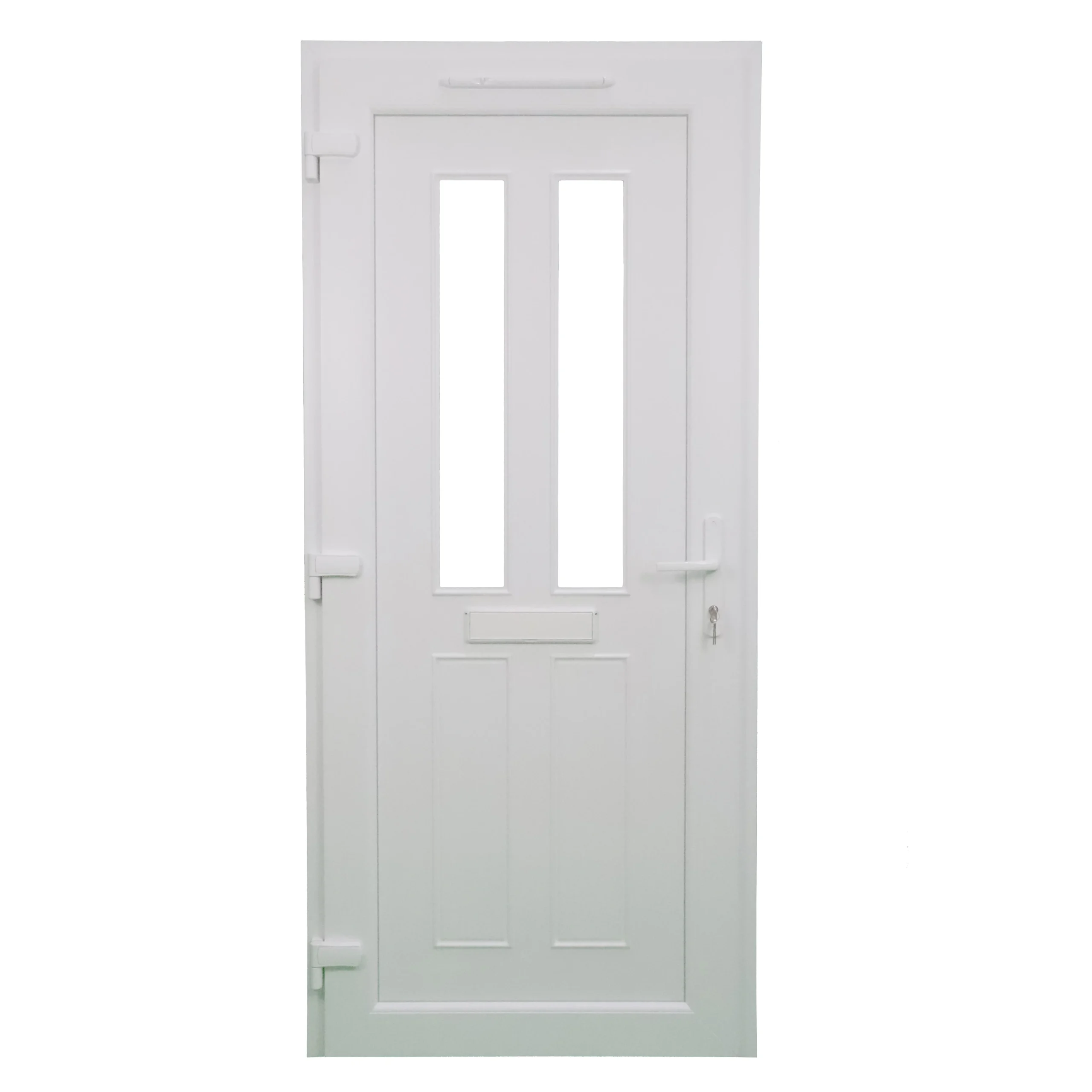 Fortia Chesil Frosted Double Glazed White Right-hand External Front Door set, the perfect addition to any home. This door is made from a strong uPVC material and features a double glazed frosted glass panel for added privacy. It comes with a 3D adjustable hinge system and cylinder lock, as well as a multipoint locking system with four mushroom heads and dead bolt for maximum security. It also meets EN 14351-1 standards and has been UKCA marked for domestic use.