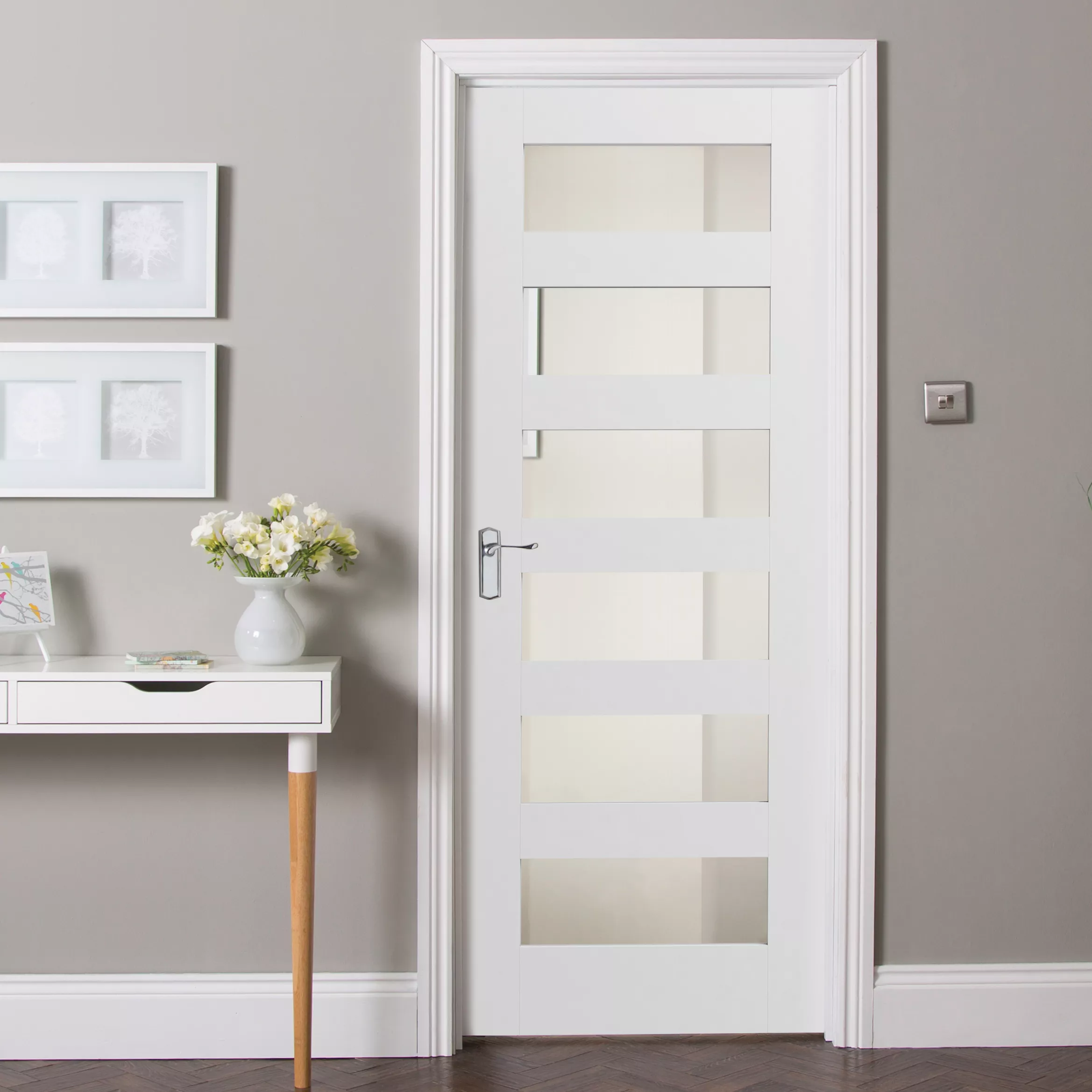 Make a real statement with this 6 panel primed shaker door. Pre-primed white, so it’s ready for whatever final finish you have in mind. Each door is supplied with a 4mm trim option on the 2 long edges with a 6mm trimming allowance on the top and bottom. Primed doors feel solid and heavy in weight, and they are double coat primed in the factory, ready for a final coat of paint of your choice. The clear glass allows light to penetrate through from one space to another which is ideal for dark hallways