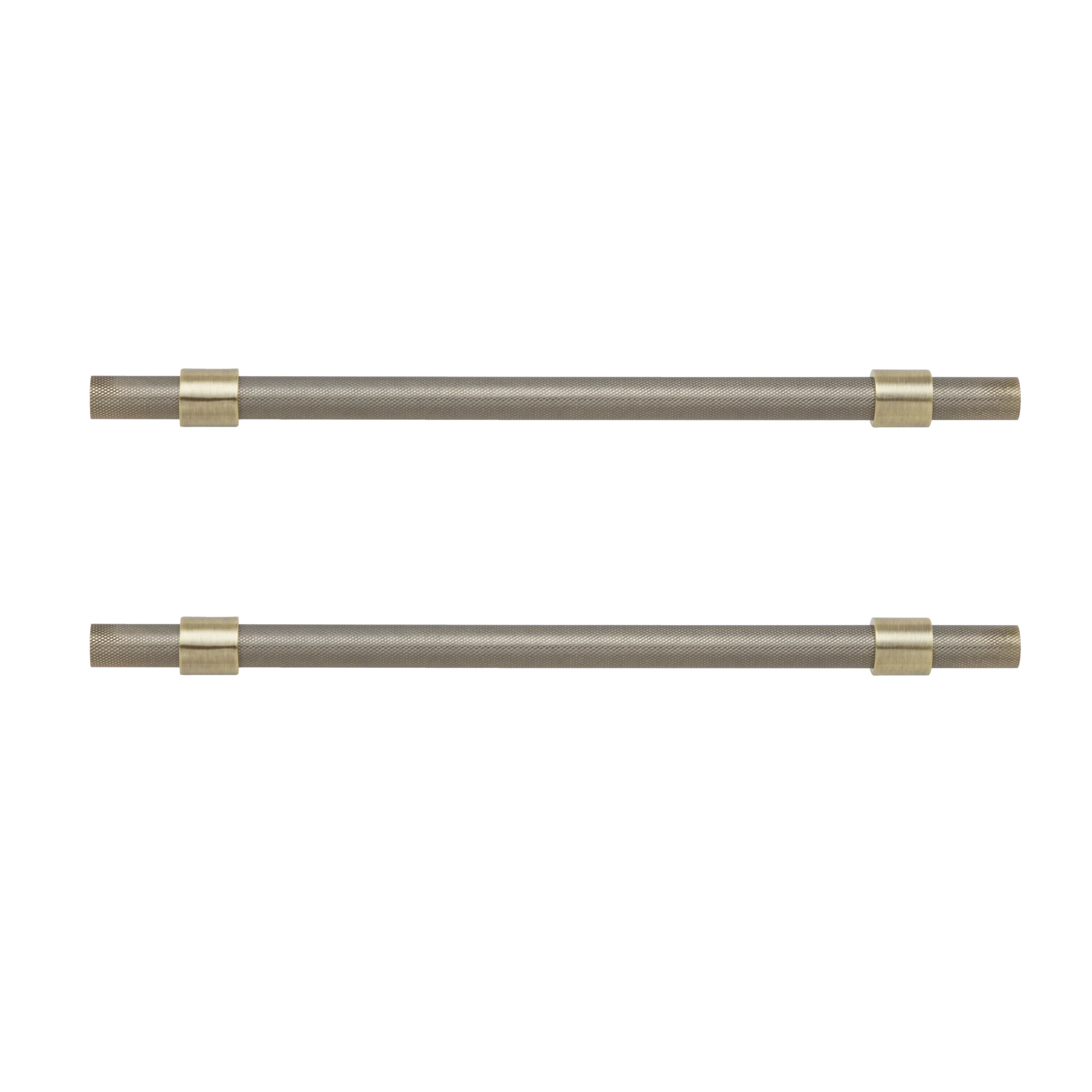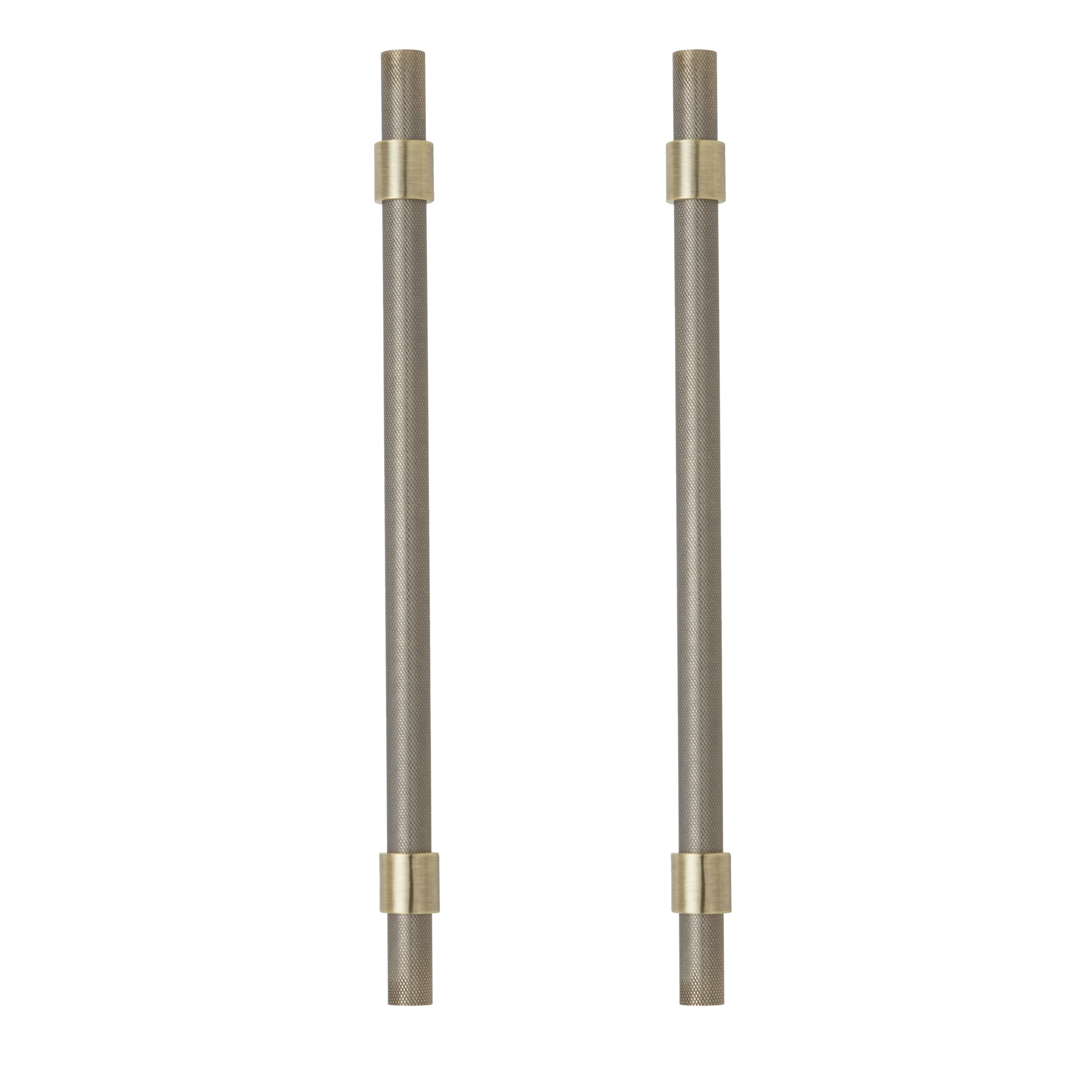 - Distinctive bar handle with an embossed textured finish in an antique brass finish