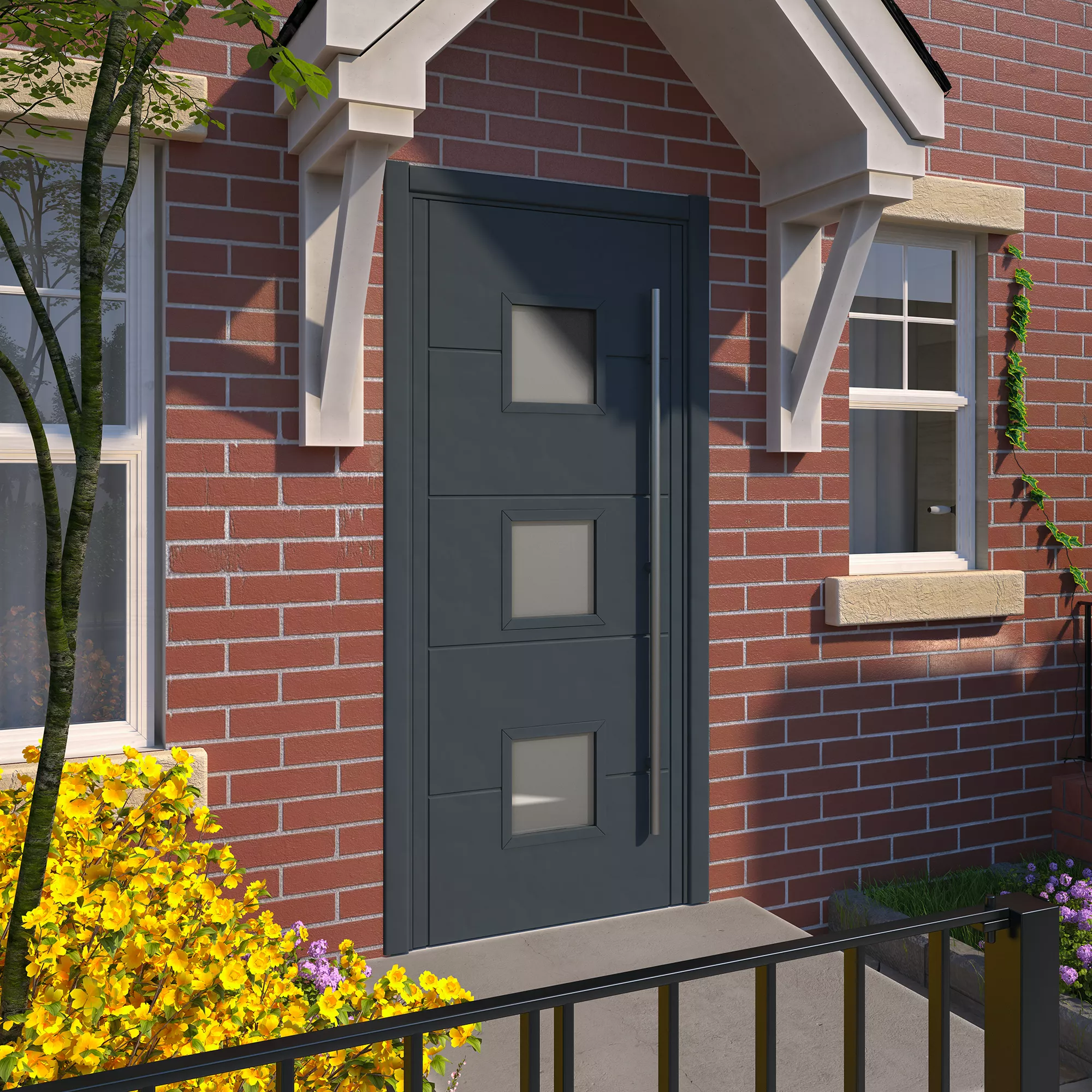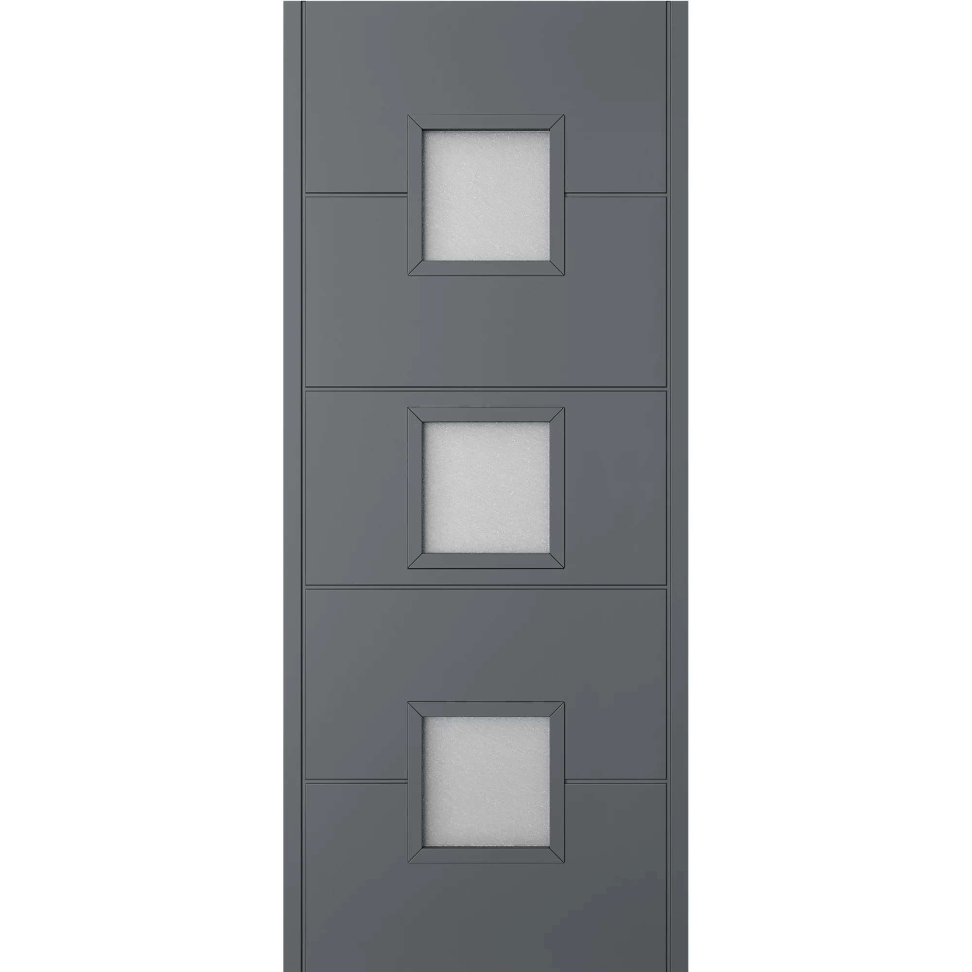 A 5-panel door with 3 square panes of frosted glass fully finished grey front exterior door.