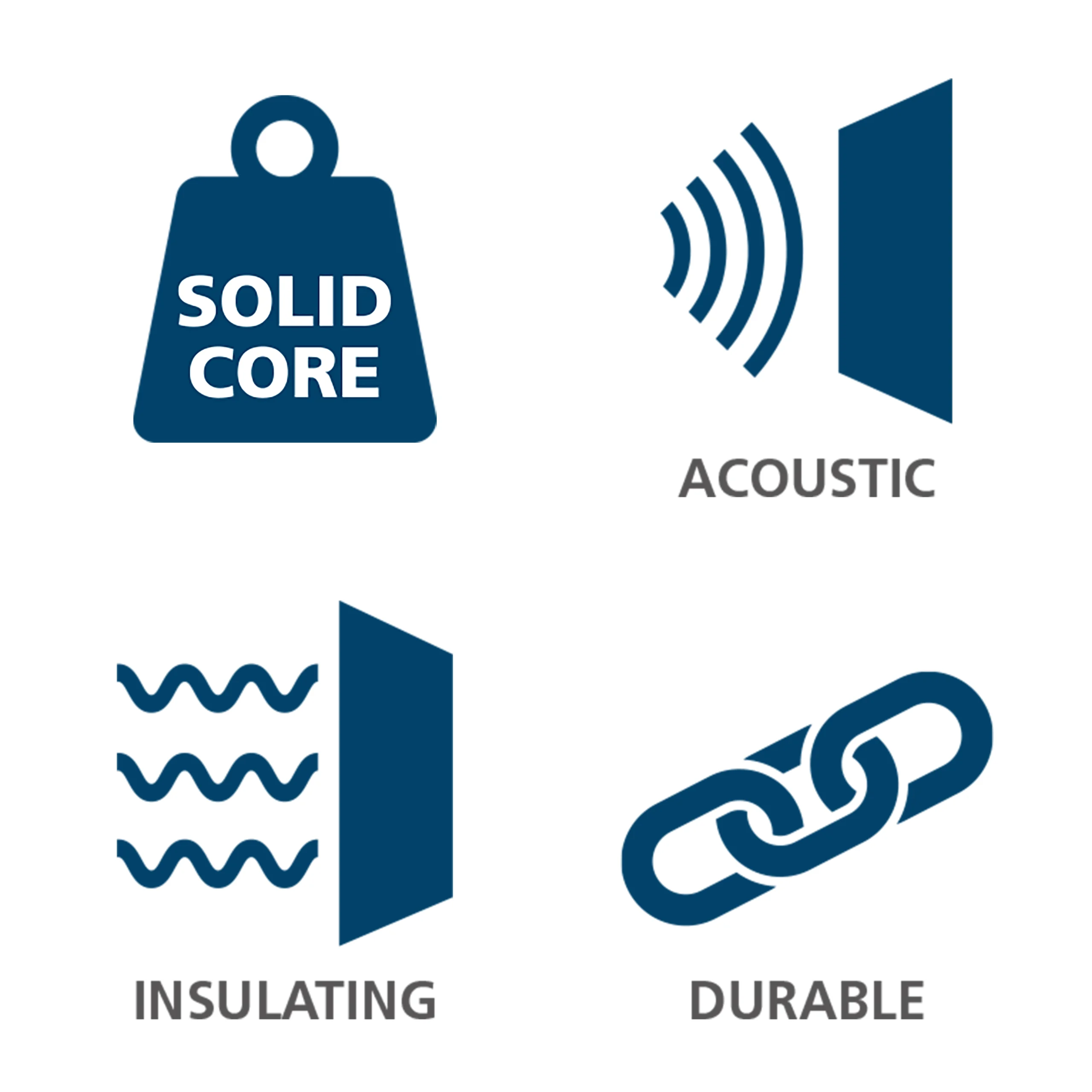 - Solid core for a heavyweight feel, as well as improved performance and durability vs hollowcore doors