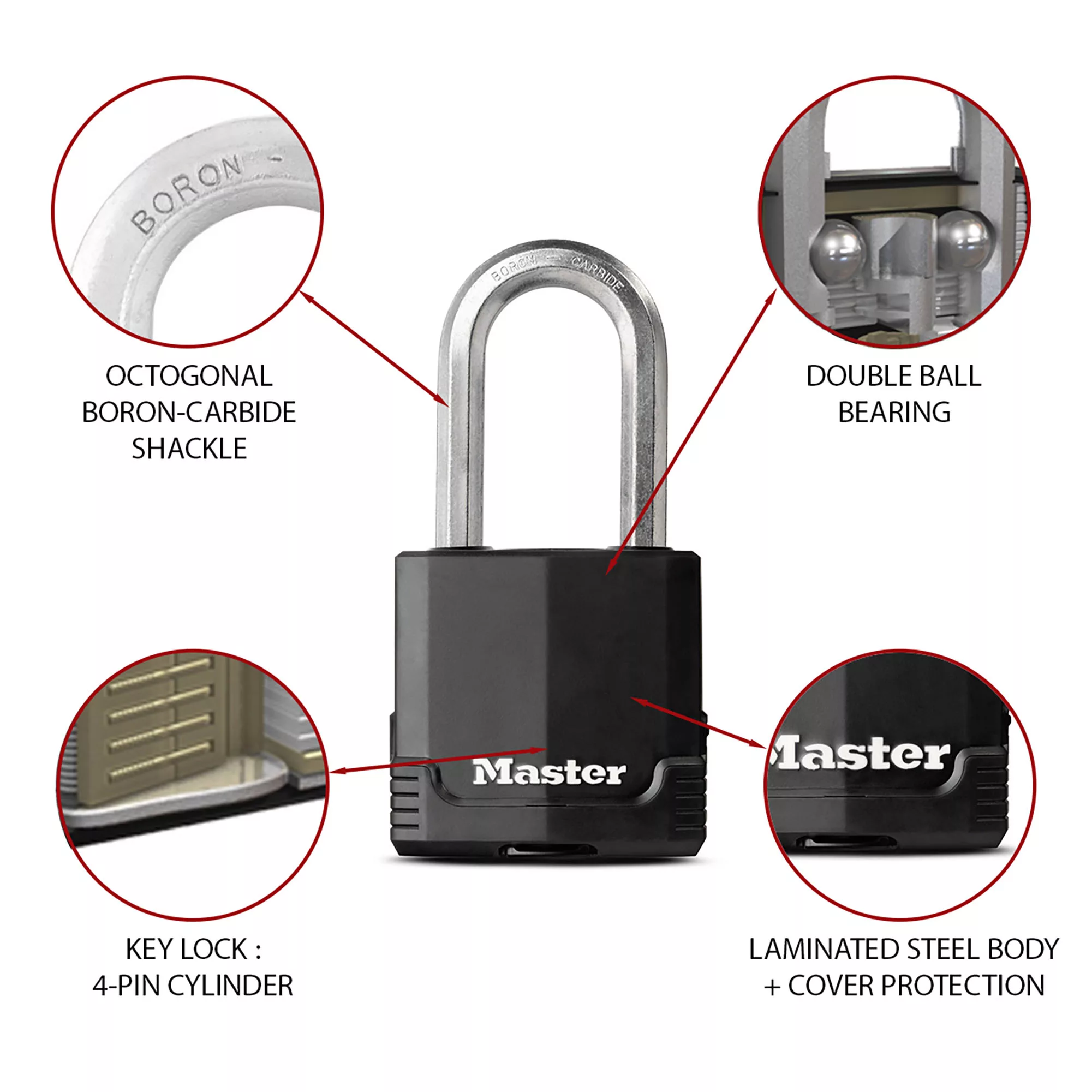 The Master Lock Excell® No. M515EURDLH Laminated Padlock features a 54mm wide laminated steel body for maximum strength and reliability, and is surrounded by stainless steel and zinc outer components for weather resistance. The Limited Lifetime Warranty provides peace of mind from a brand you can trust.
