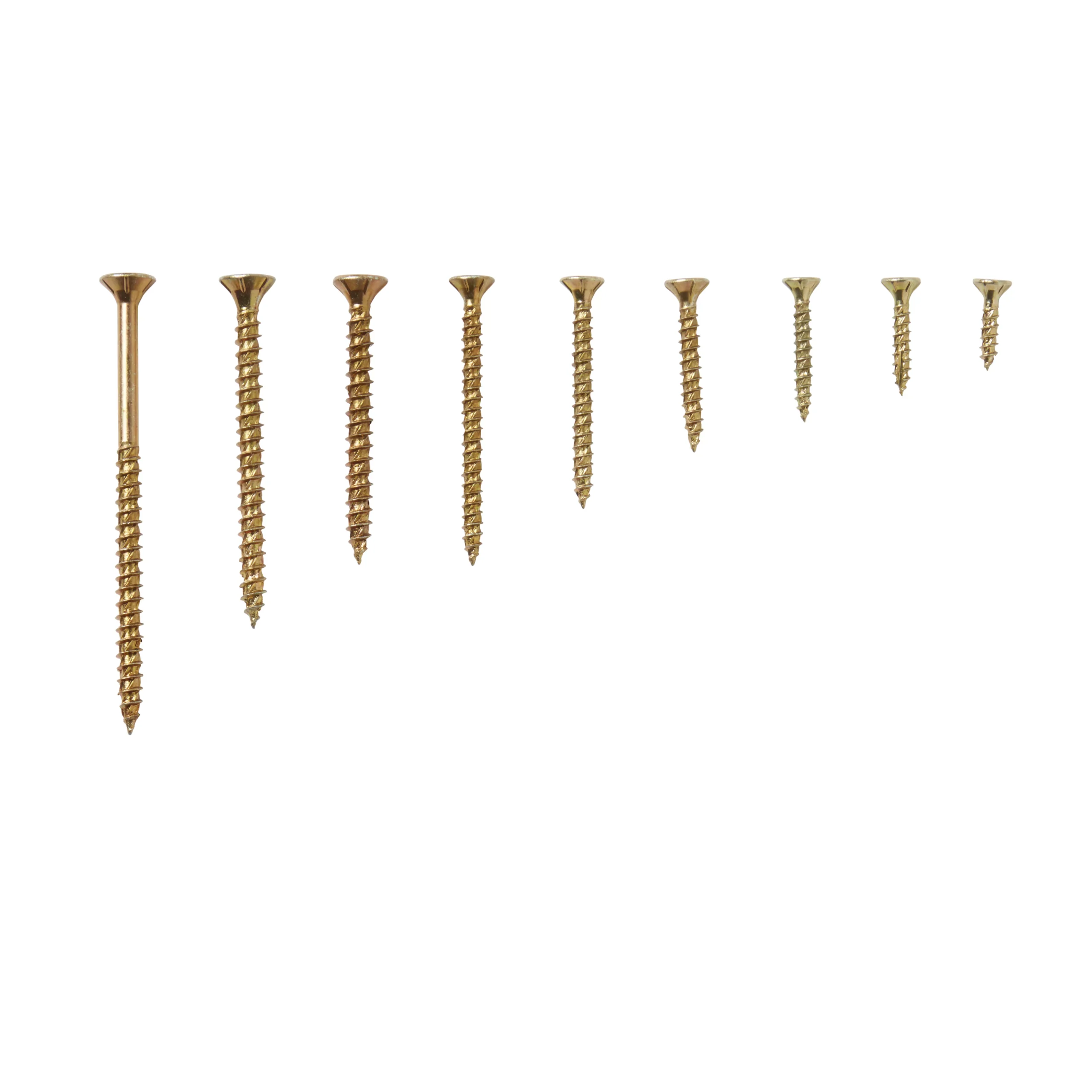 This pack of 1200 assorted yellow zinc plated double countersunk premium wood screws are constructed from durable steel. Whether you need a Torx T15, T20 or T25 screw, you will be prepared for the job. This pack is ideal for a range of DIY projects.